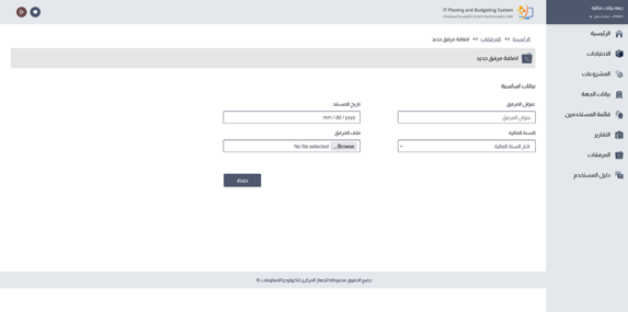 إضافة المرفقات لإضافة المرفقات يتم الضغط على زر " + " من صفحة " المرفقات المدرجة " يتم تعبئة البيانات التالية : السنة المالية تاريخ المستند عنوان المرفق
