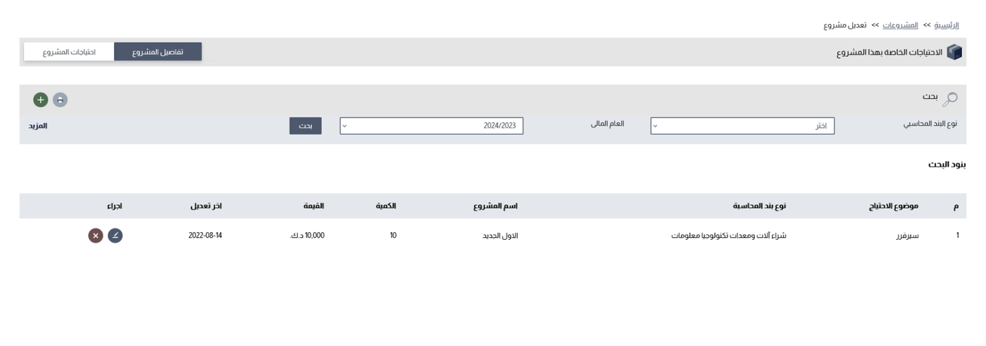 لإضافة احتياج الى مشروع يتم الضغط على" قائمة احتياجات المشروع " بالأعلى من داخل صفحة تعديل المشروع ثم الضغط على زر " + " من قائمة " الاحتياجات الخاصة بهذا المشروع " ويتم تعبئة البيانات أنظر إضافة احتياج