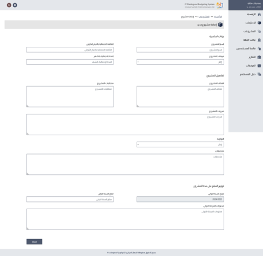 لإضافة مشروع يتم الضغط على زر " + " من صفحة " المشاريع المدرجة " ويتم تعبئة البيانات التالية :