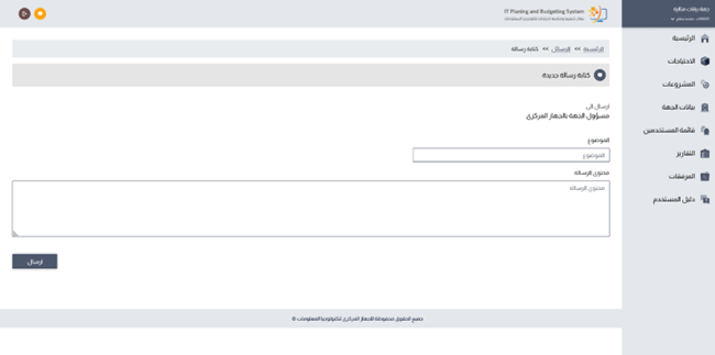 إرسال رسالة جديدة يتم الضغط على زر" + " من صفحة " الرسائل" قسم الصادر ويتم تعبئة البيانات التالية : الموضوع نص الرسالة ويتم الضغط على زر" إرسال " أدني الصفحة
