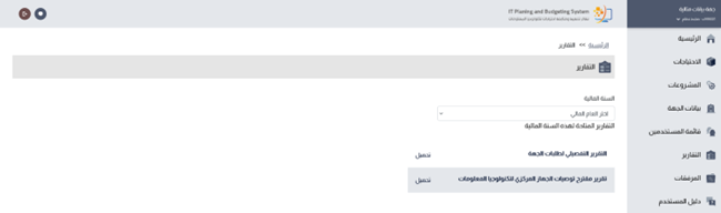 تتوافر التقارير بعد أدخال البيانات الخاصة بالوضع الحالي وطلبات الاحتياجات الخاصة بالسنة المالية الجديدة وتوجد العديد من التقارير التي تتوافر تباعا ومتجددة لتسهيل طرق عرض البيانات المدخلة وقائمة الاحتياجات.