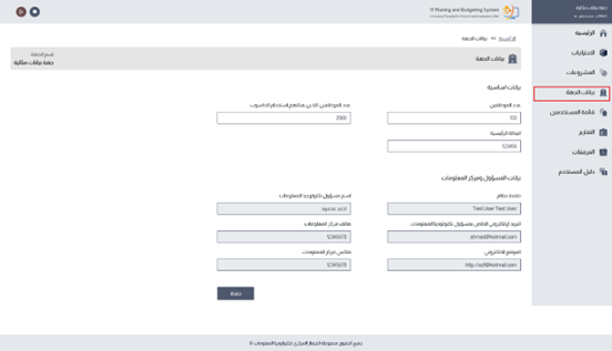 تسجيل وتعديل البيانات الخاصة بالجهة الحكومية من معلومات عامة ومعلومات خاصة بضابط النظام ومسؤول مركز المعلومات.