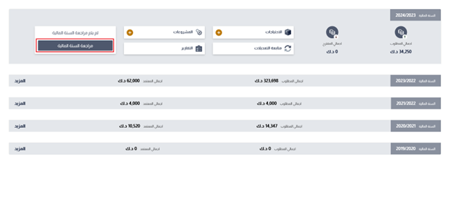 مراجعة واعتماد الميزانية السنوية للسنة المالية تستخدم لمراجعة واعتماد الميزانية السنوية للسنة المالية وتتم عن طريق الذهاب الي " الصفحة الرئيسية " ثم الضغط على " مراجعة السنة المالية " واعتمادها.